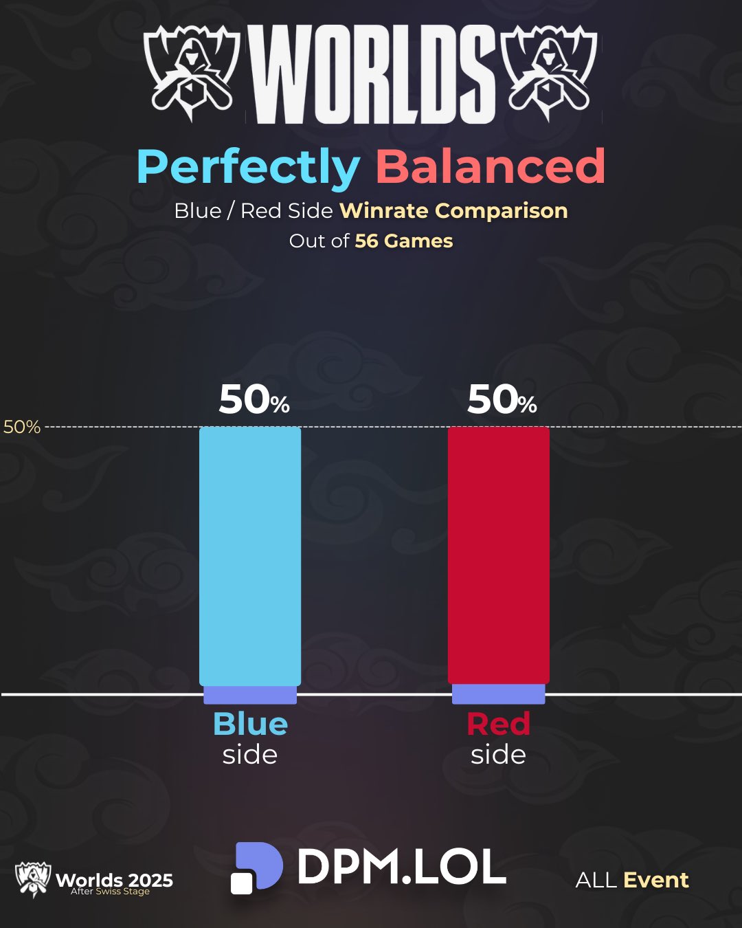 56場比賽藍(lán)色方勝率50%,板外比賽紅色方勝率50%。媒統(tǒng)