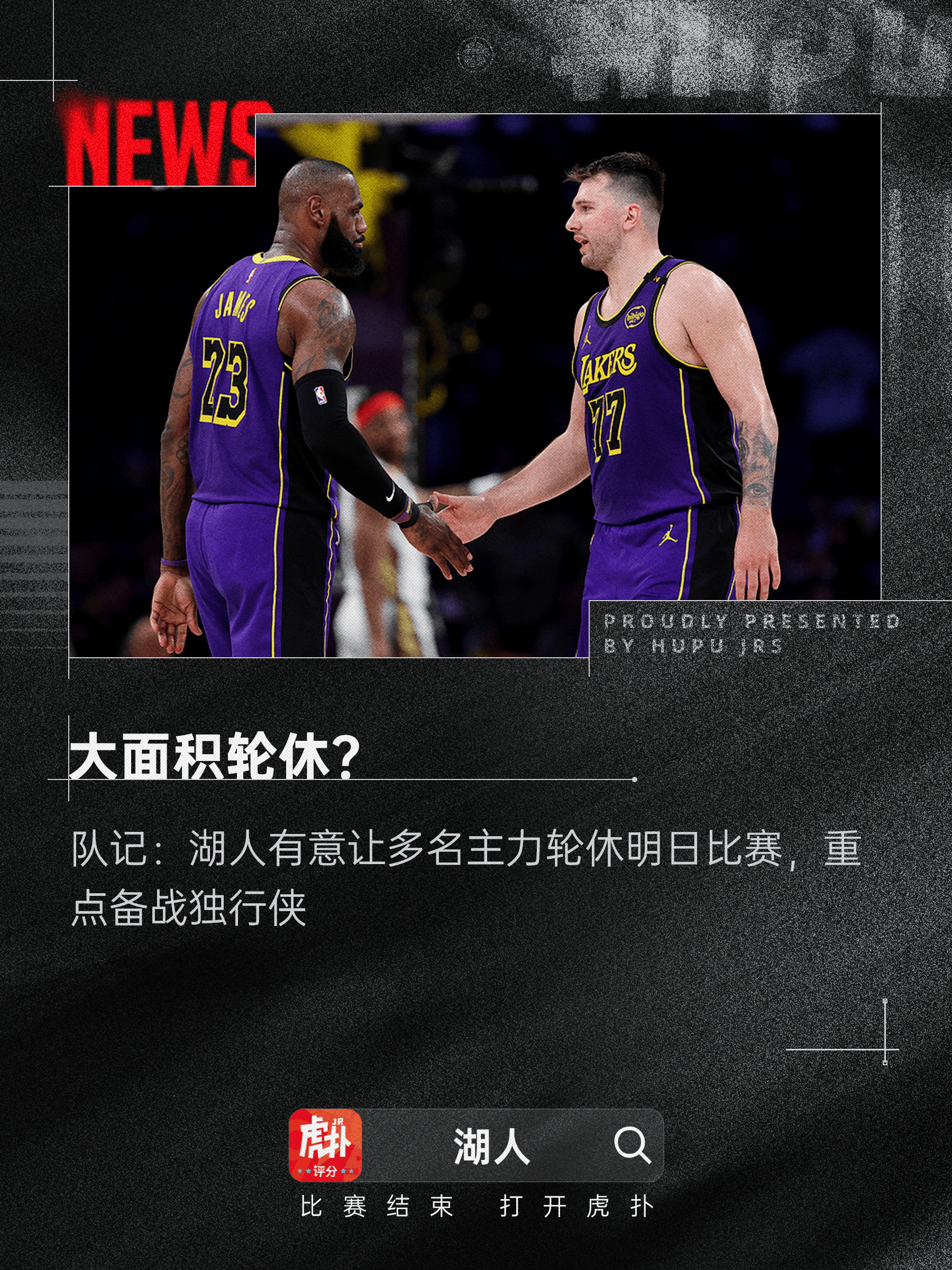 顯然,流言輪休湖人似乎有意在周三對陣?yán)做陌尻牨荣悅鋺?zhàn)比賽中讓多名主力球員輪休(該比賽未安排全美直播)。