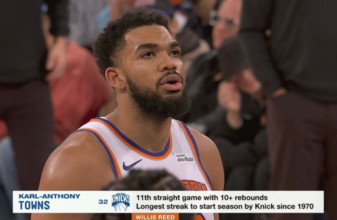 至此,唐斯在賽季開賽至今的11場(chǎng)比賽里籃板球全部達(dá)到兩位數(shù),這是尼克斯隊(duì)史自從1970年(威利斯-里德)至今首位拿到此數(shù)據(jù)的球員。