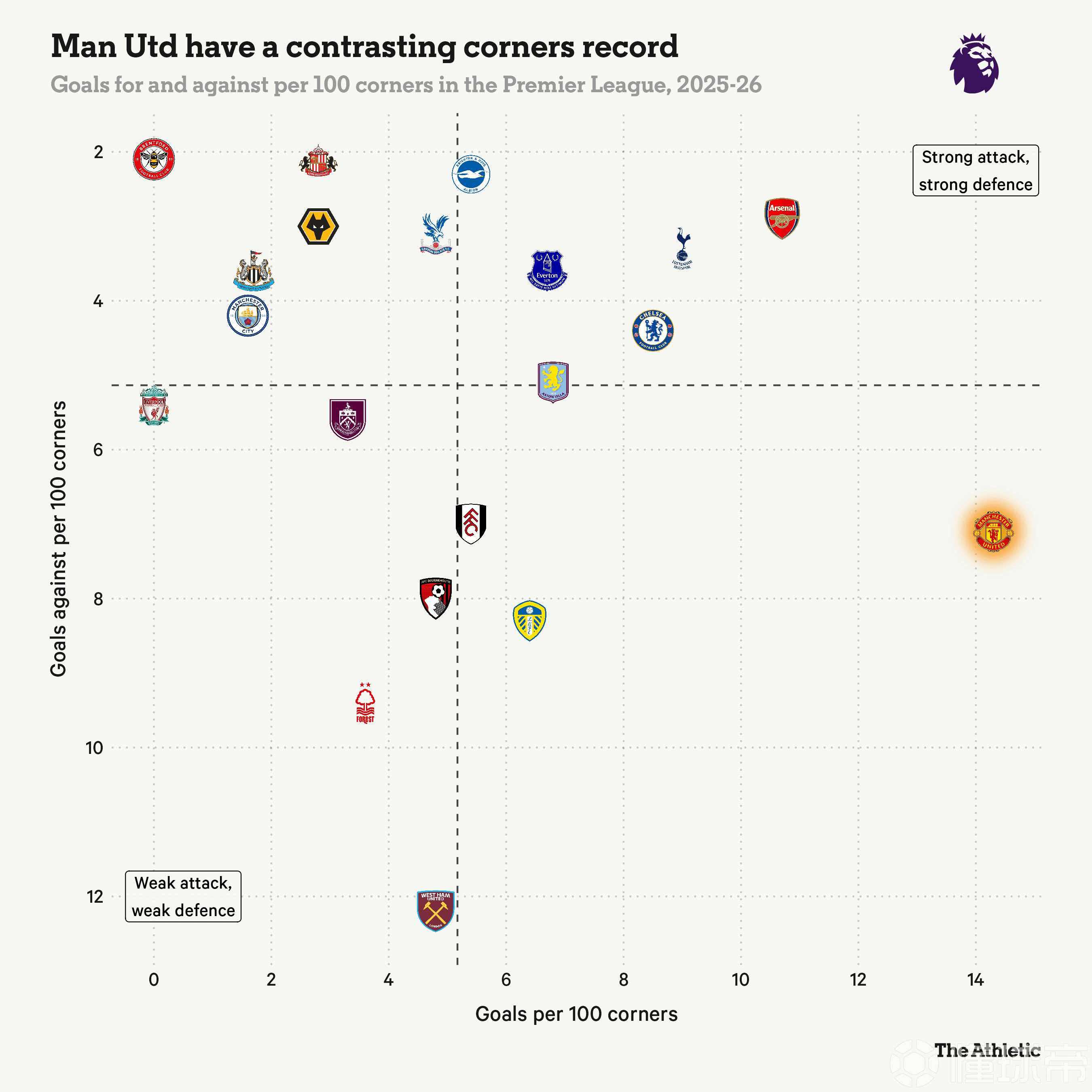 防守方面,曼聯(lián)每100個角球失球7.1個——觀察每百次角球數(shù)據(jù)可以在所有球隊間創(chuàng)造一個公平的競爭環(huán)境,因為各隊面對的角球次數(shù)可能不同——這是本賽季英超第五差的數(shù)據(jù)。然而他們每100個角球能進14.3個,這在2025-26賽季英超聯(lián)賽中高居榜首。此外他們每100個角球也能創(chuàng)造7.1個預期進球,這是本賽季英超第二好的數(shù)據(jù)。除了引進姆伯莫改善了曼聯(lián)的角球傳中質量之外,球隊在戰(zhàn)術意圖上更加清晰,球員們的意識也更強了。