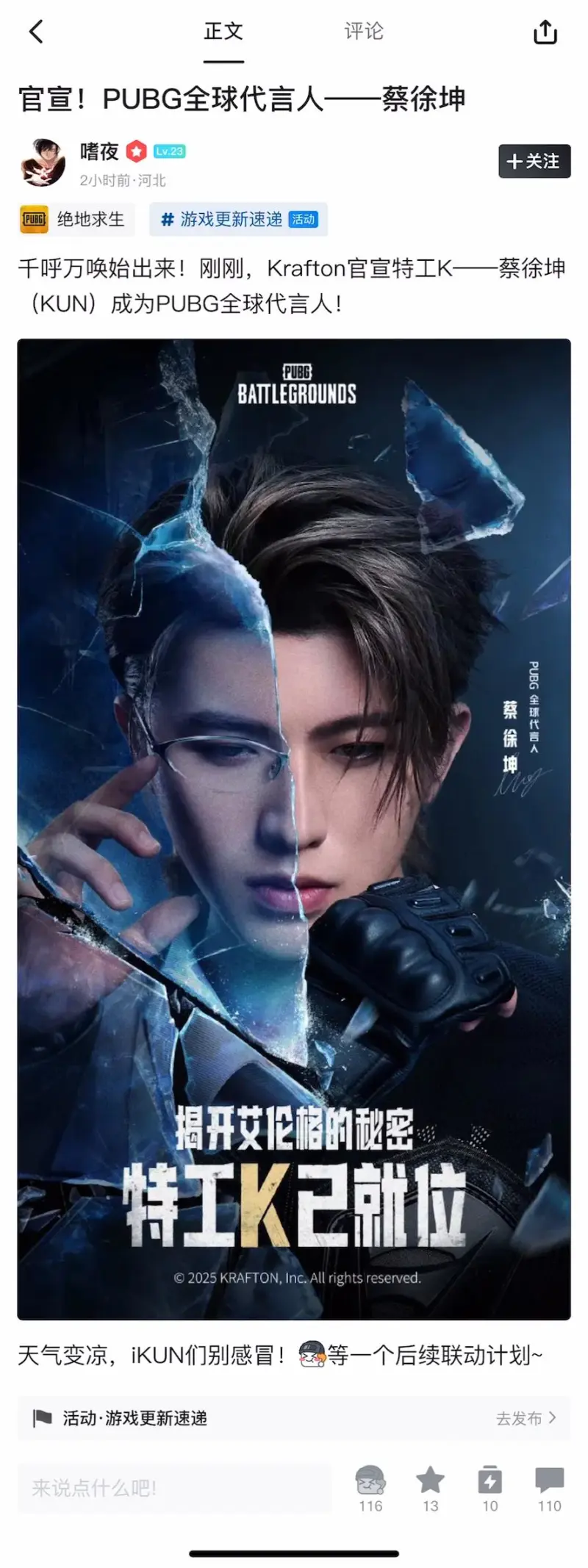 PUBG官宣全球代言人--蔡徐坤由黑衣dk 發(fā)表在絕地求生 https://bbs.hupu.com/pubg