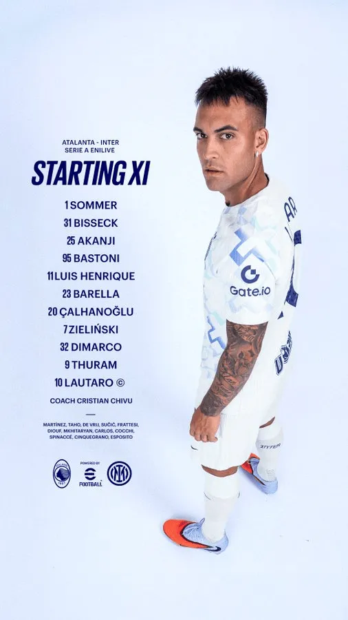 國米首發(fā):1-索默、25-阿坎吉、31-比塞克、32-迪馬爾科、95-巴斯托尼、7-澤林斯基、20-恰爾汗奧盧、23-巴雷拉、11-恩里克、9-圖拉姆、10-勞塔羅