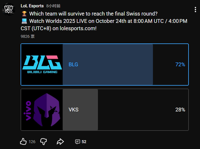 虎撲10月24日訊 2025全球總決賽瑞士輪正在進(jìn)行,LoL官方發(fā)布BLG對陣VKS賽果預(yù)測投票。獲勝