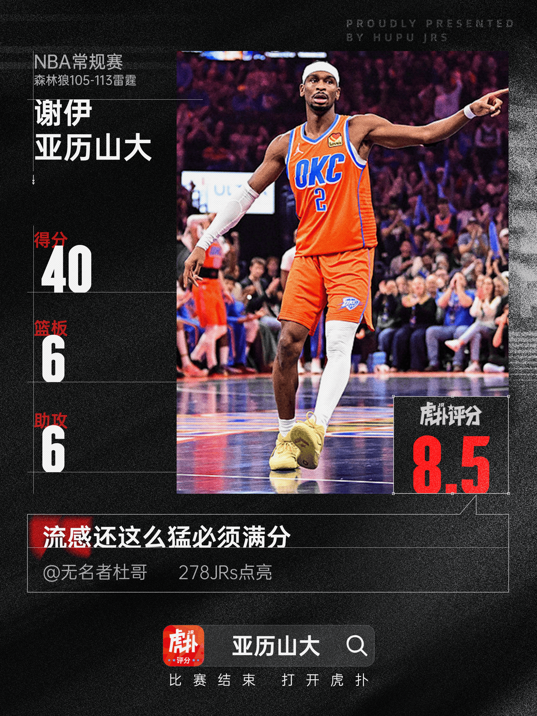 本場比賽,場砍雷霆球員謝伊-吉爾杰斯-亞歷山大出戰(zhàn)36分鐘,下分19投12中,其中三分球2投1中,罰球17投15中,得到40分6籃板6助攻3搶斷。