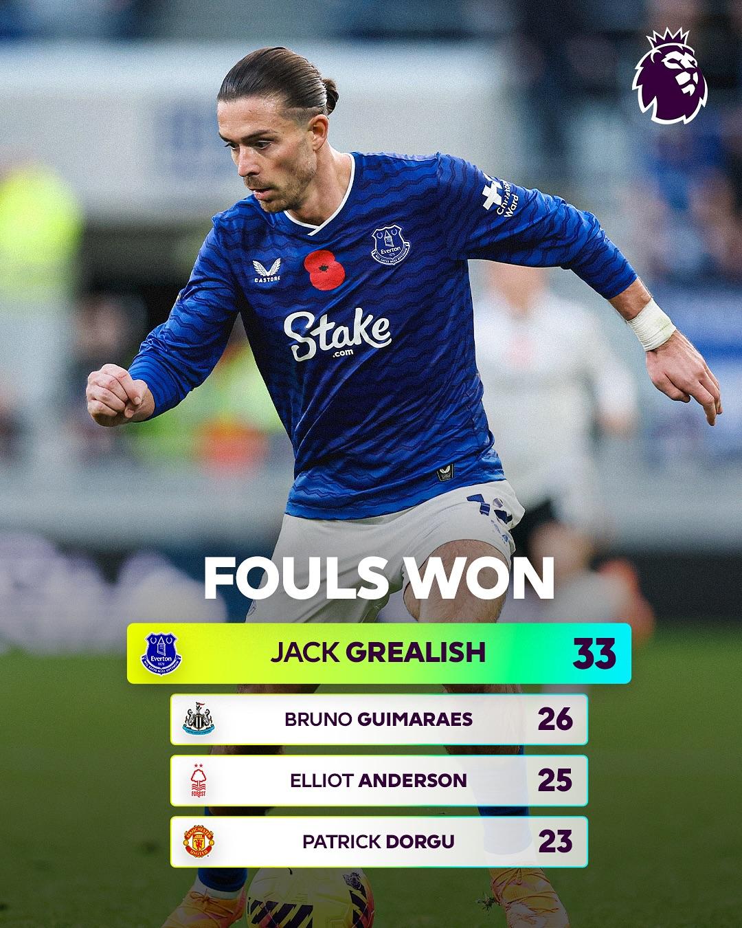 虎撲11月13日訊 英超官方數(shù)據(jù)統(tǒng)計(jì)本賽季至今英超球員被犯規(guī)次數(shù),格拉利什33次最多,賽季數(shù)格什最多爾古23次排名第四。英超