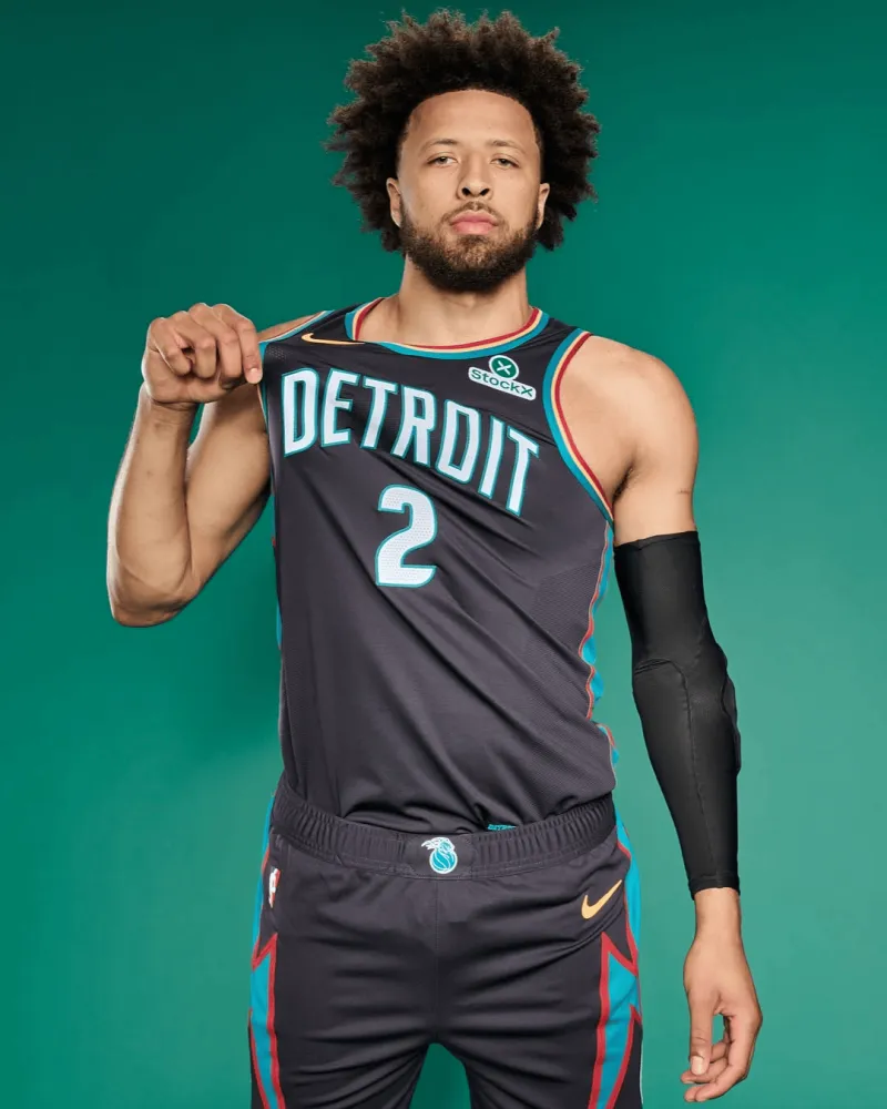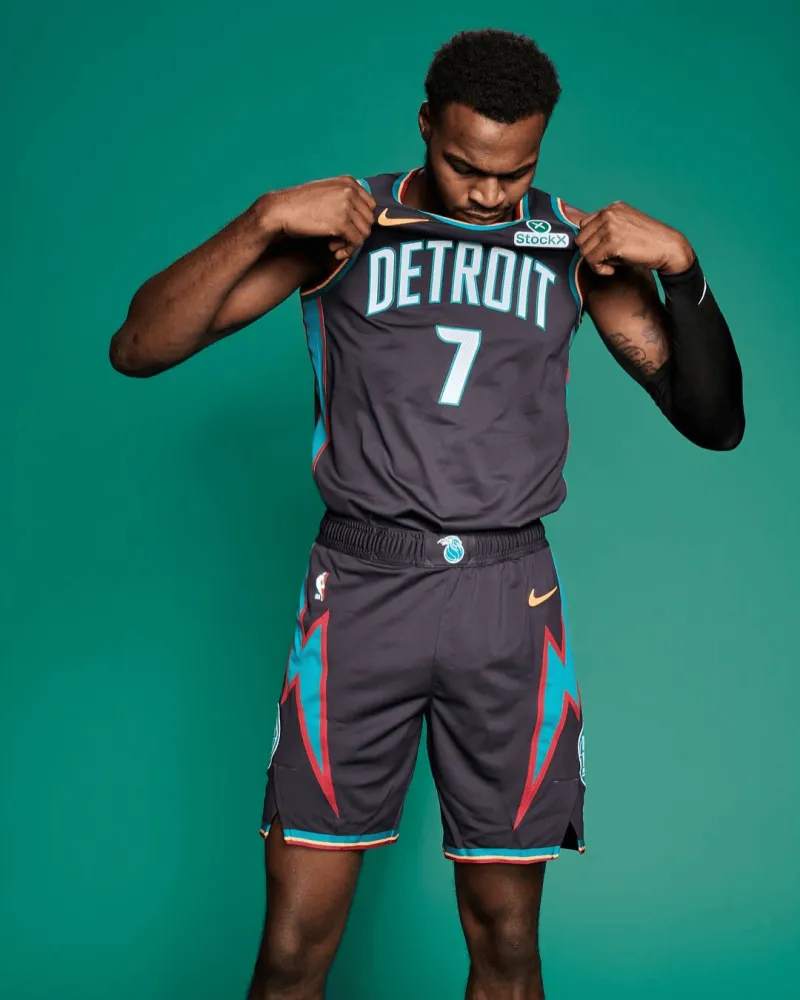 此球衣采用了活塞隊(duì)90年代球衣的隊(duì)展栗色、日晷黃和藍(lán)綠色。示本賽季