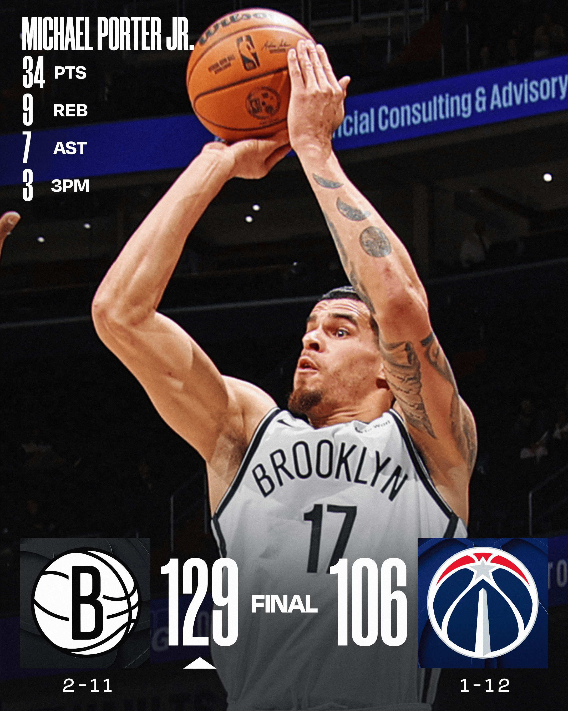 虎撲11月17日訊 今天NBA常規(guī)賽,奇才主場以106-129不敵籃網(wǎng)。網(wǎng)主網(wǎng)