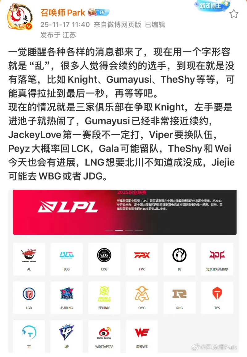 一覺睡醒各種各樣的消息都來了,現(xiàn)在用一個字形容就是“亂”,很多人覺得會續(xù)約的選手,到現(xiàn)在就是沒有落筆,比如Knight、Gumayusi、TheShy等等,可能真得拉扯到最后一秒,再等等吧。
